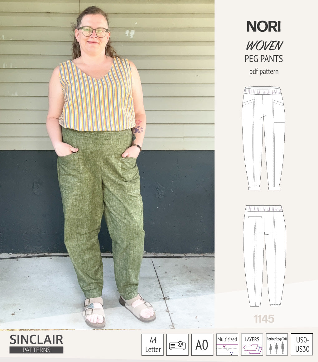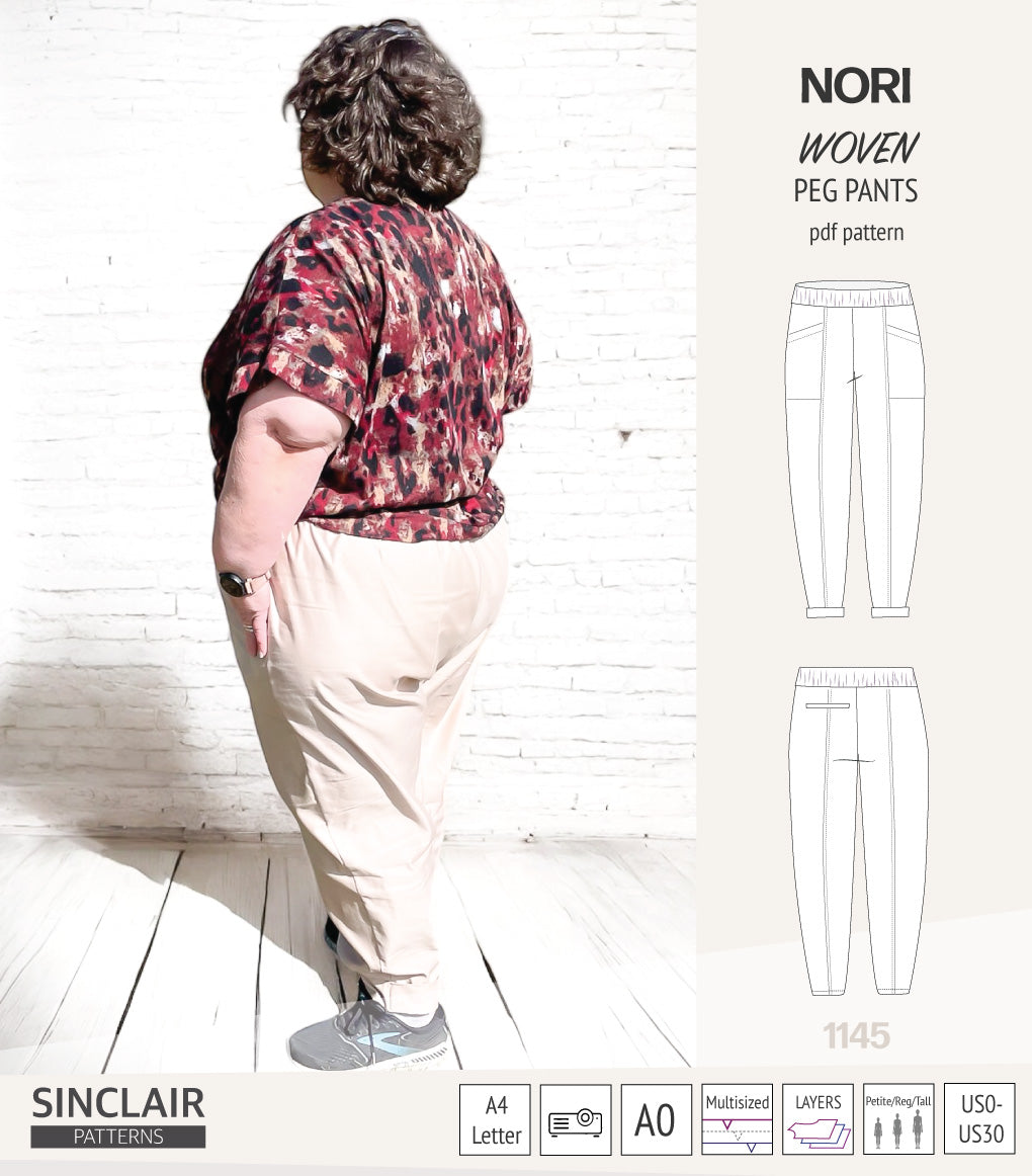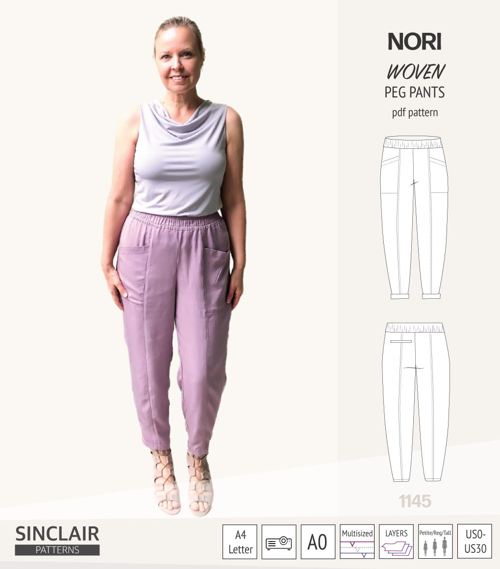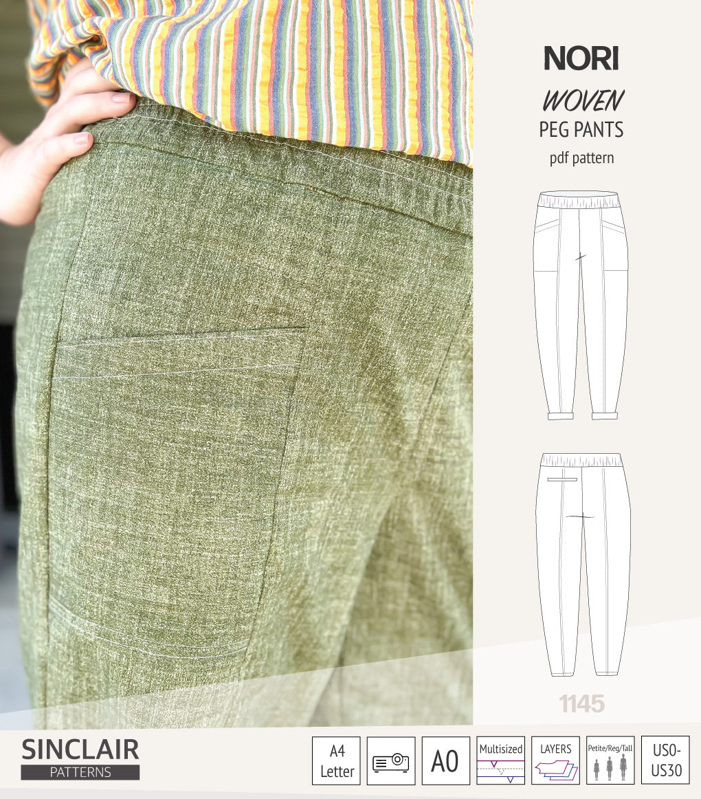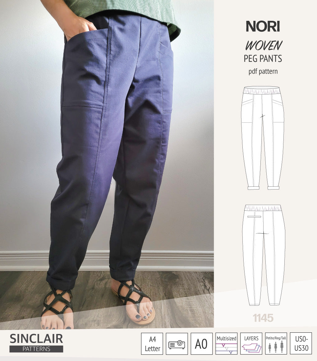 Featuring: Easy-fitting peg-style trousers, relaxed at the hips and knees and tapered to the ankles, with center front and back seams along the legs. Designed for woven fabrics. These trousers come in ankle length and can be hemmed or finished with simple cuffs. The waistband is fitted with a wide elastic (32 mm / 1 1/4 in). They can be finished with slide-in front pockets or a simple back zippered pocket.