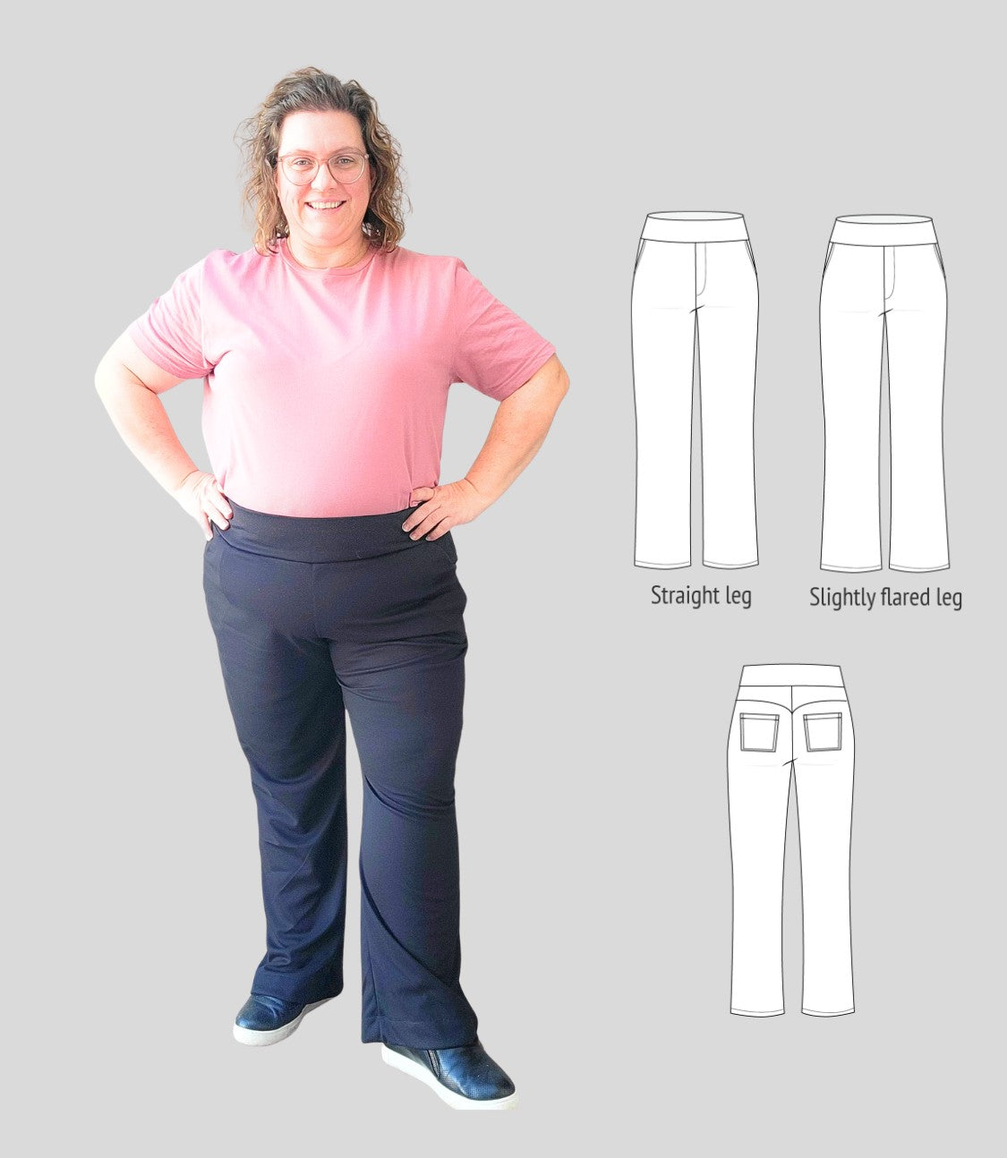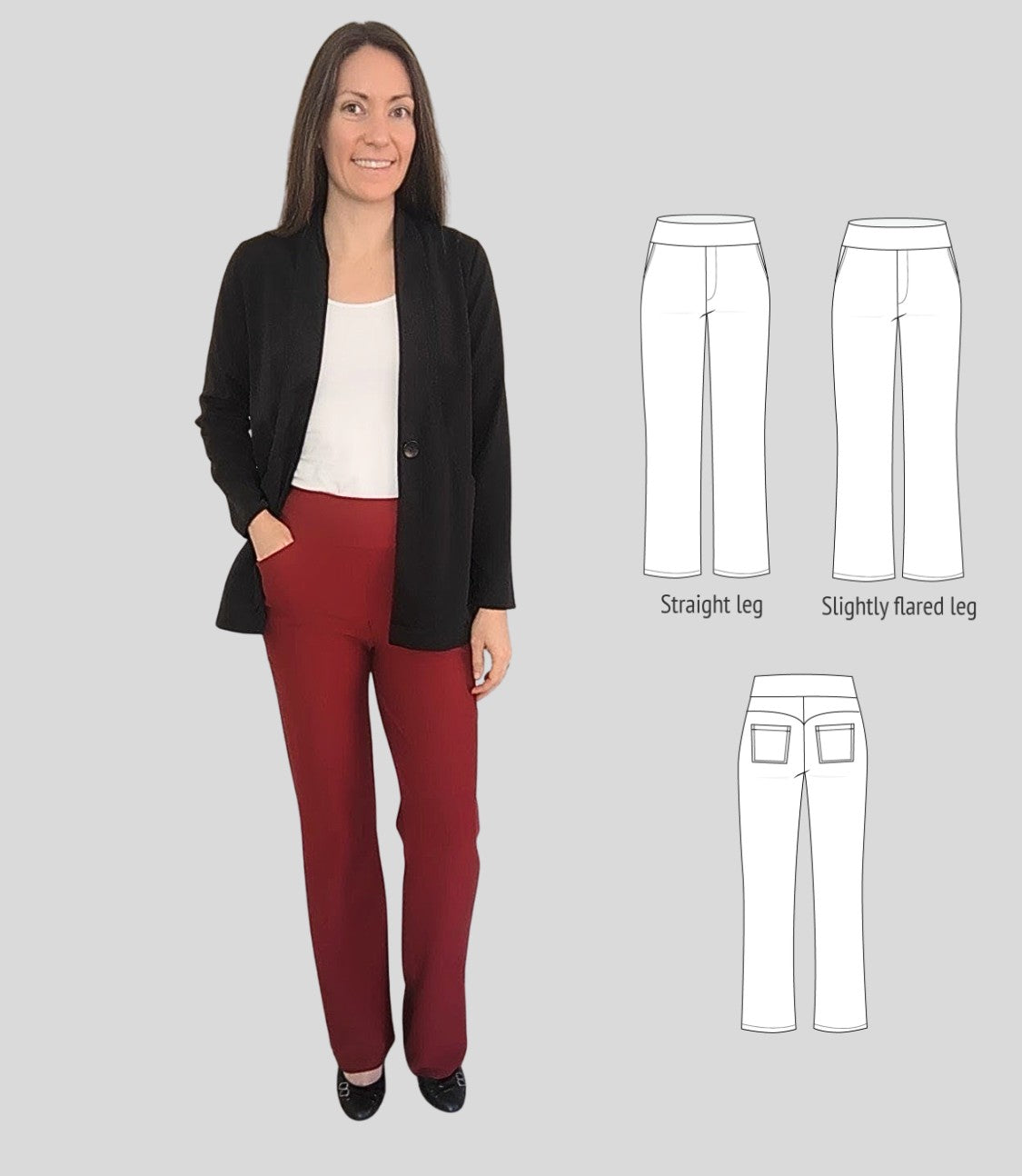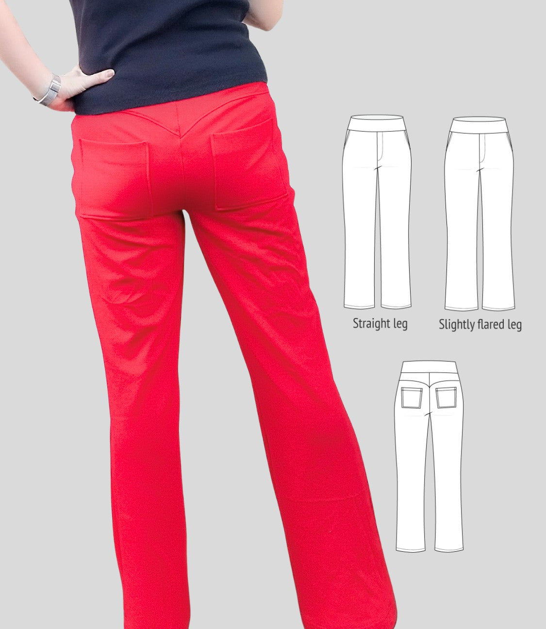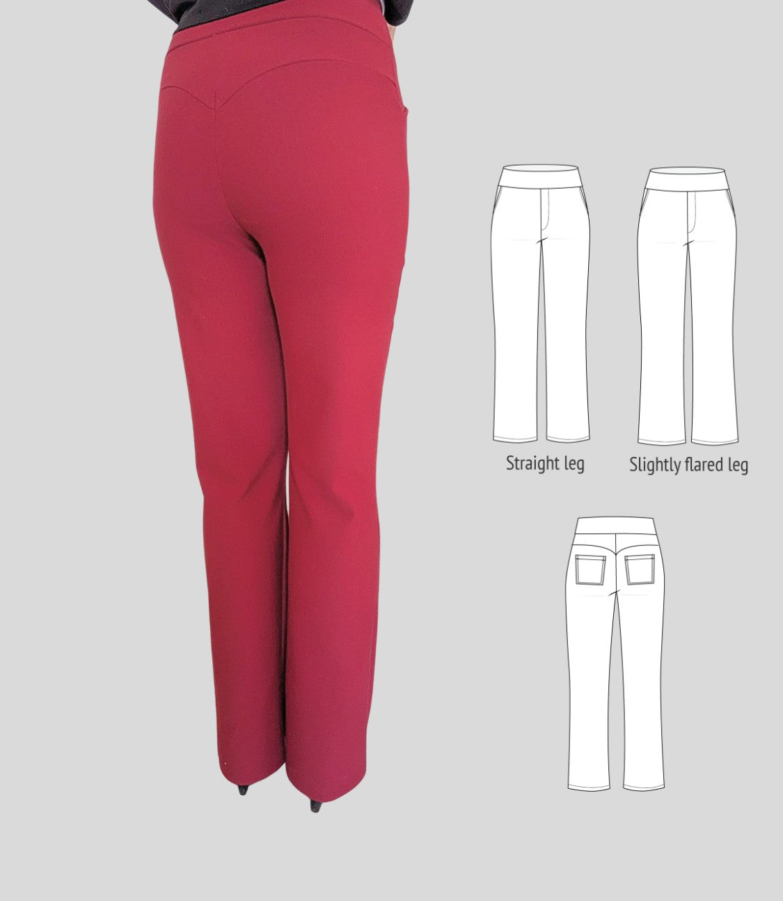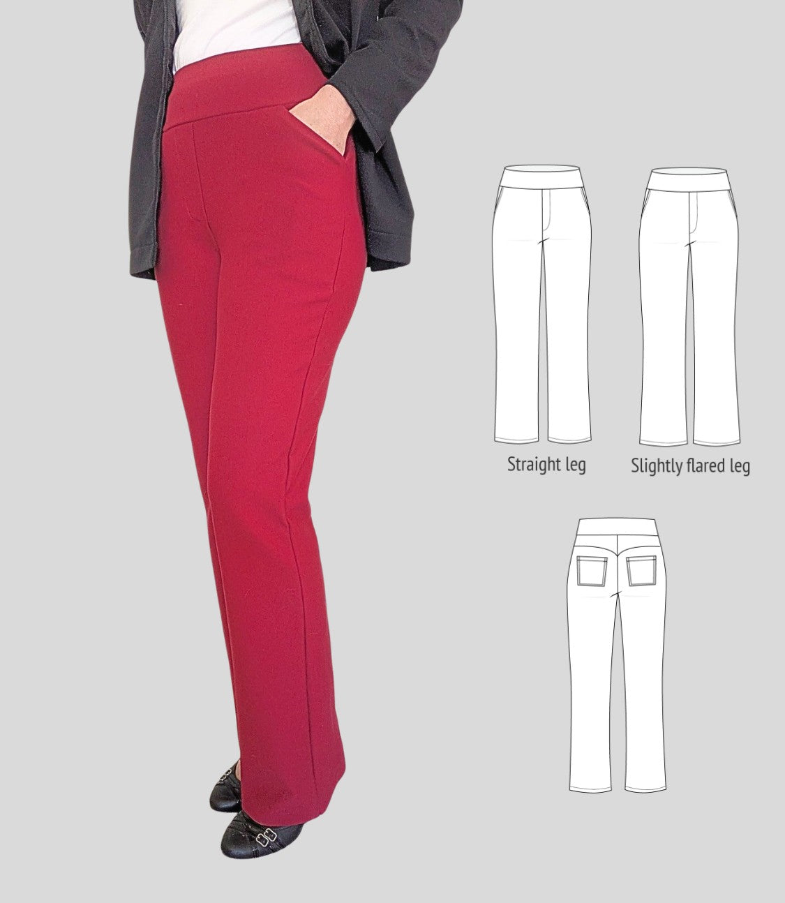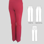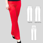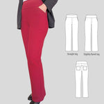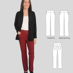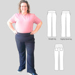 Fit and options: Fitted at the hips and waist, straight or slightly flared leg pants designed for medium to heavy weight knit fabrics like ponte, crepe double knits and similar. Contouring yoke at the back. Finished with contoured waistband that is reinforced with elastic. Optional faux fly, side and back patch pockets.