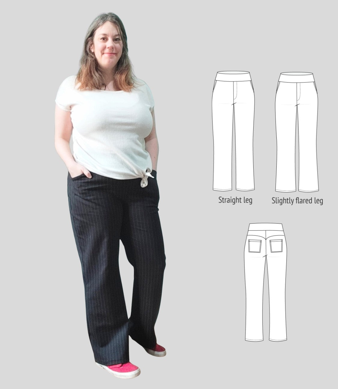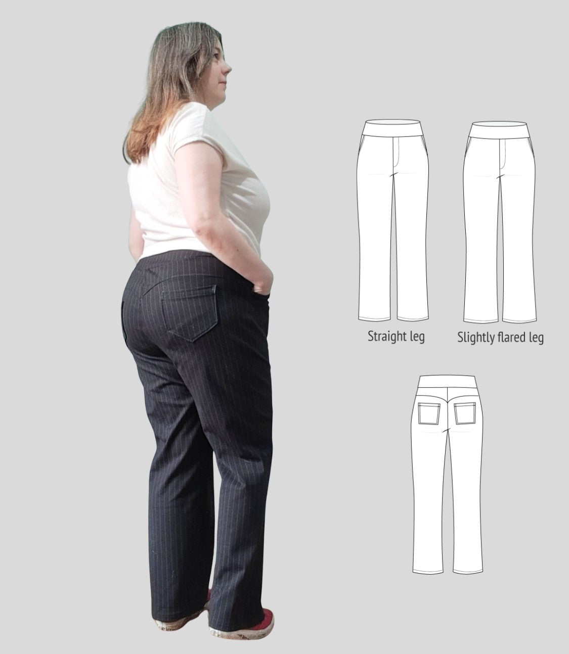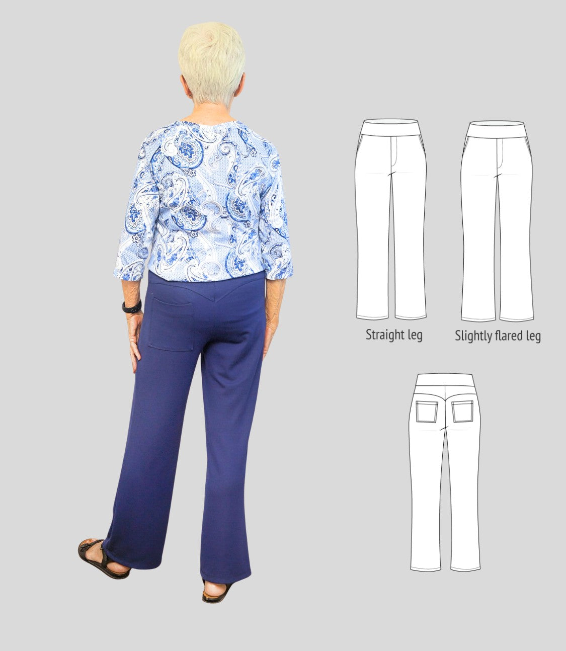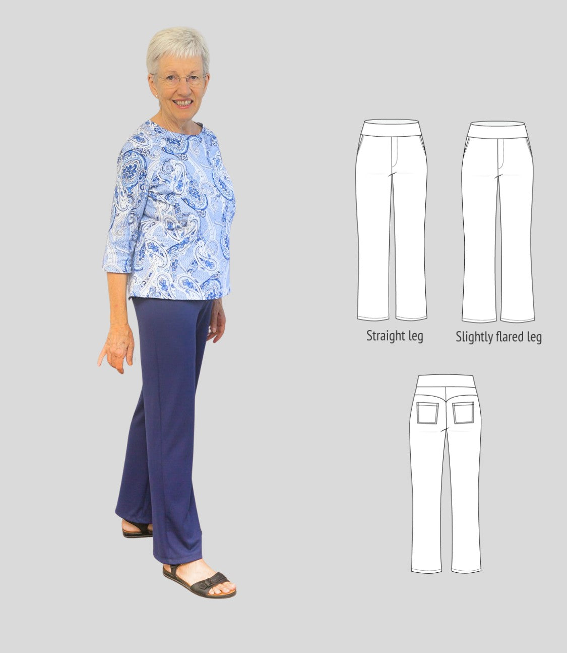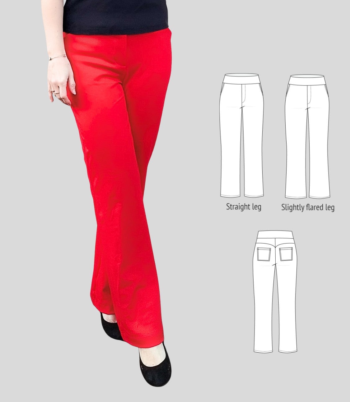 Fit and options: Fitted at the hips and waist, straight or slightly flared leg pants designed for medium to heavy weight knit fabrics like ponte, crepe double knits and similar. Contouring yoke at the back. Finished with contoured waistband that is reinforced with elastic. Optional faux fly, side and back patch pockets.
